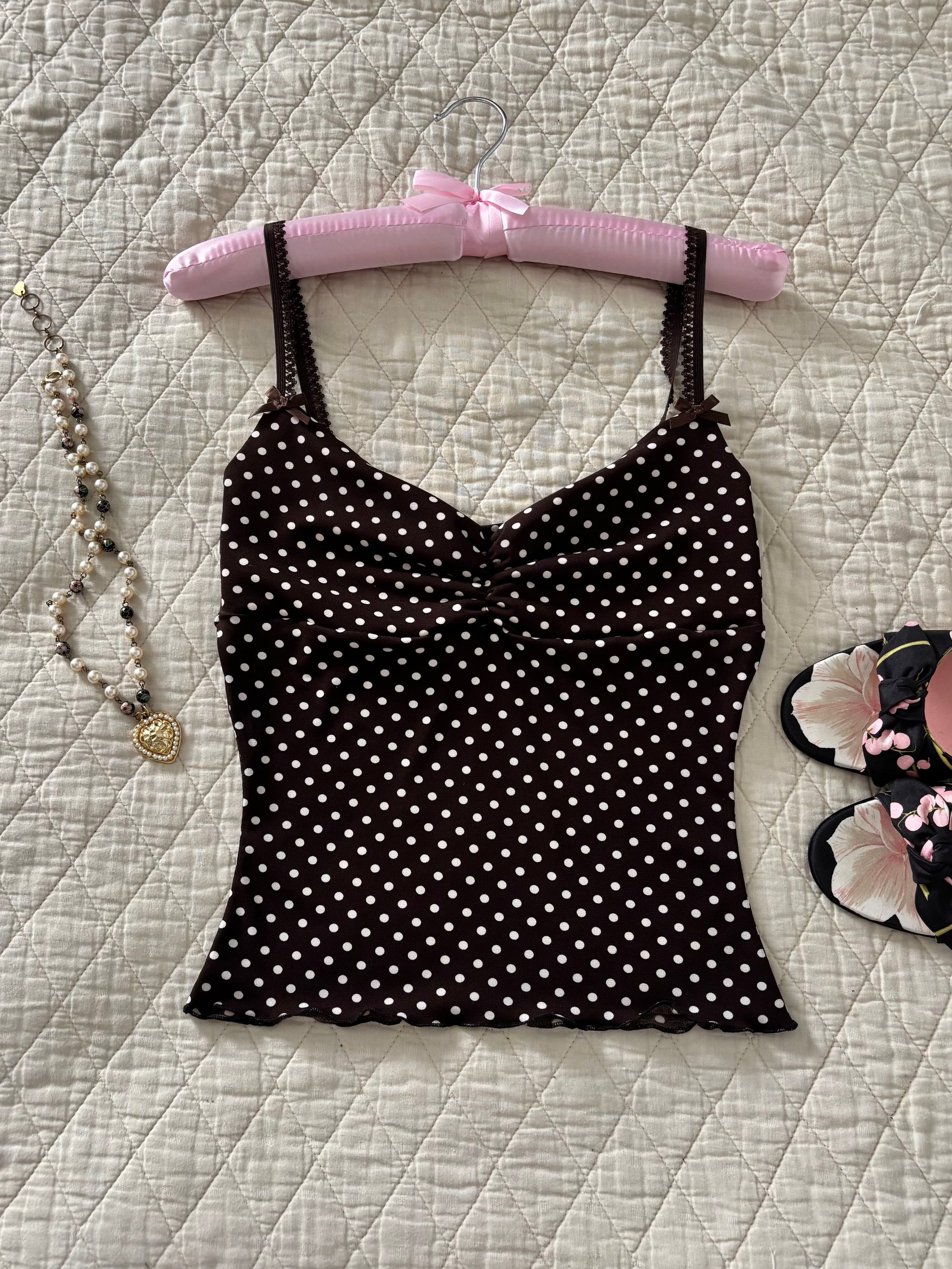 🤎Crafted from a 4-way stretch brown polka dot fabric with dark brown lace and a dainty bow detail.